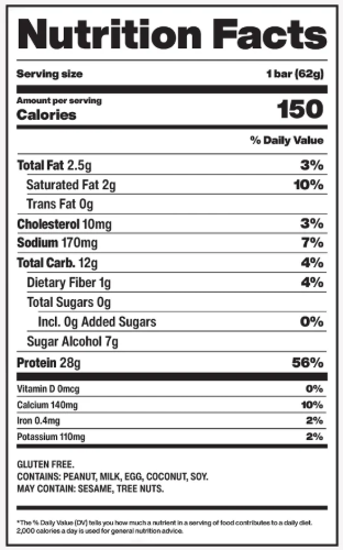 28 g de proteína, 150 calorías y 0 g de azúcar.