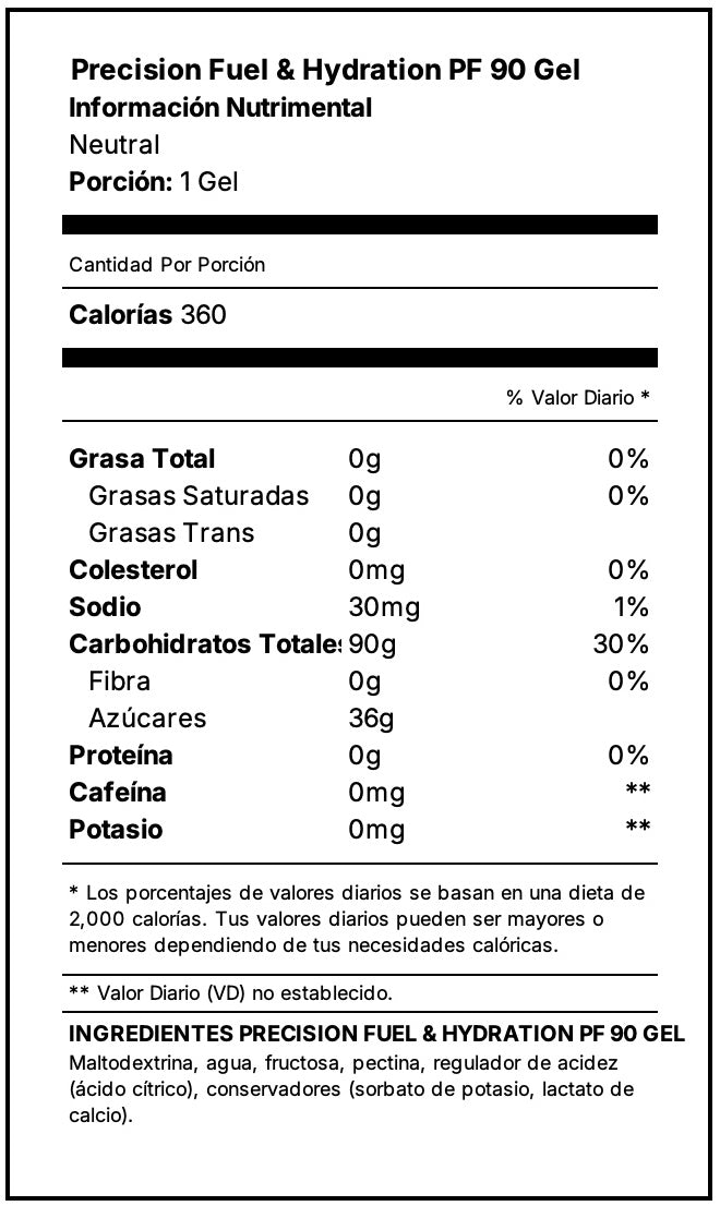 Precision Fuel & Hydration ofrece soluciones de nutrición deportiva basadas en evidencia científica y utilizadas por atletas de alto rendimiento en todo el mundo. El PF 90 Gel está diseñado para quienes necesitan una dosis alta de carbohidratos sin cargar con varios sobres: 90 g de energía en un solo gel, ideal para sesiones largas o intensas.