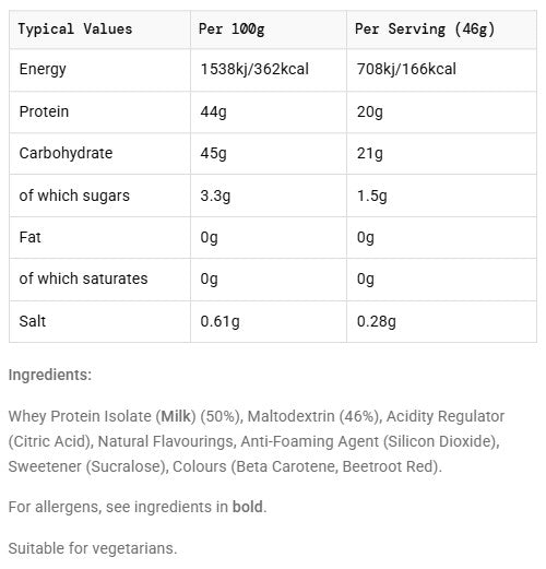 REGO Clear es la versión más ligera del clásico batido de recuperación de SiS. Combina 20g de proteína aislada de suero con 21g de carbohidratos en una mezcla transparente, fácil de tomar y de rápida absorción.